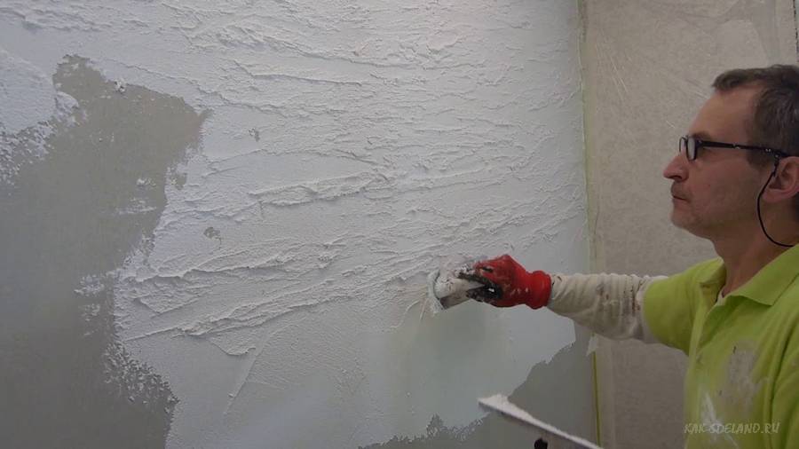 Работать рекомендуется вдвоем — один человек наносит смесь, другой формирует рисунок. Если мастер один, штукатурка делится на участки по 1-1,5 кв.м.
