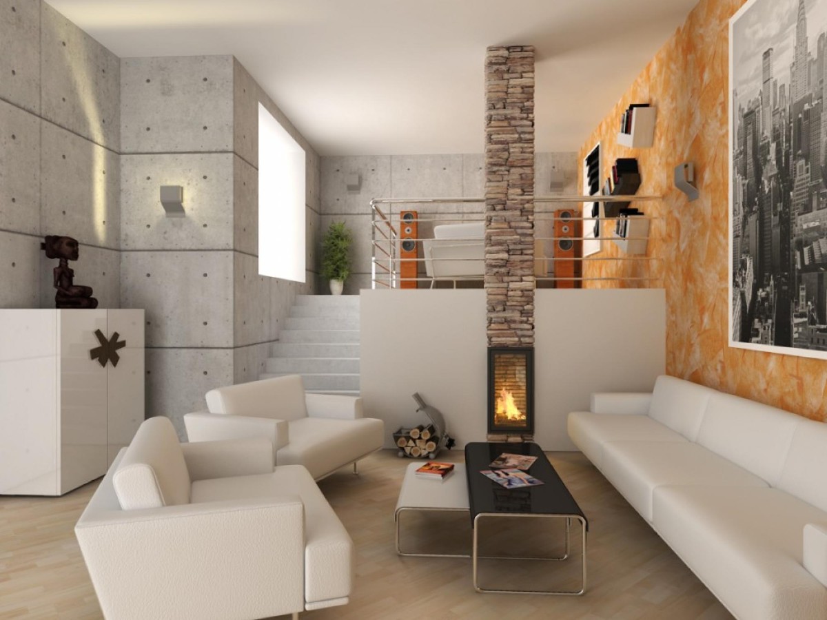 Можно выделить фактурной штукатуркой одну стену, а остальные — оформить контрастно и по фактуре, и по цвету. Вот так, например. Этот прием можно использовать в дизайне гостиных, спален.