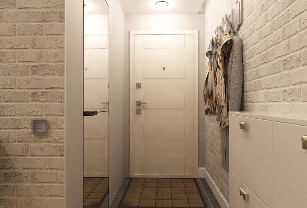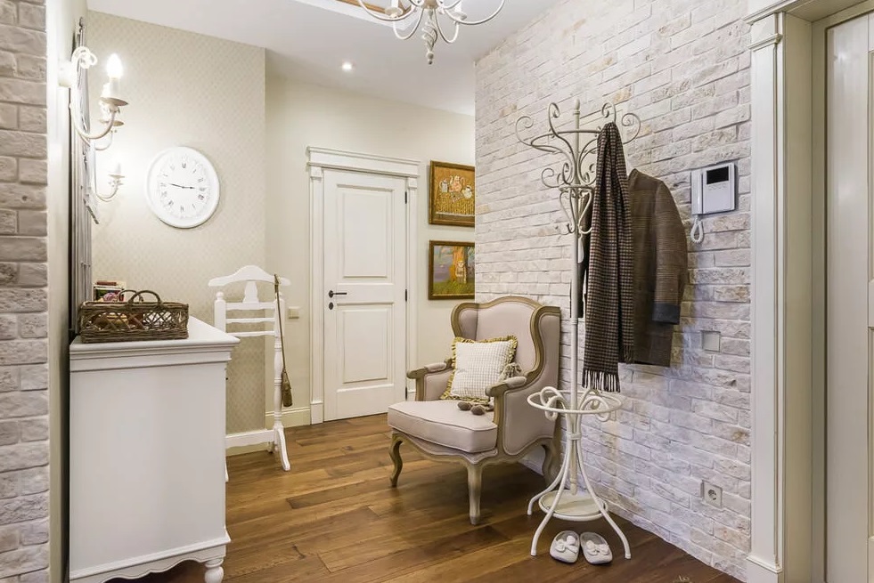 Прихожая. Фактурная стена с кирпичиками всегда уместна в прихожей. Здесь будут уместны объемные зеркала, стильные стойки для зонтов и верхней одежды из хромированного металла. При помощи этой стены можно отделить зону для верхней одежды от зоны для обуви, выложив декоративными плитками зону 80 см от пола.