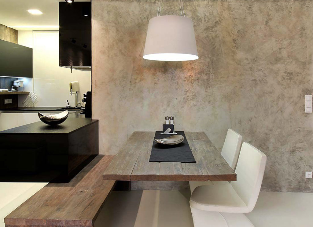 Угольная декоративная штукатурка для кухни применяется для Хай-тека, минимализма, лофта. Причем стены должны быть гладкие или с небольшим рельефом.