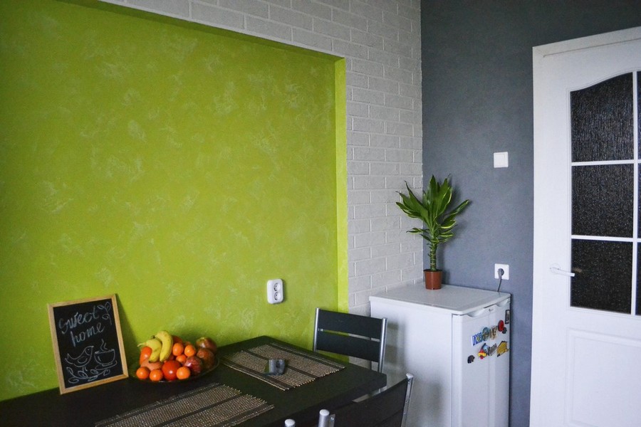 Для ярких новейших стилей подходит зеленый тон. Не обязательно оштукатуривать им всю площадь. Достаточно сделать акцент, например, на столовой зоне.