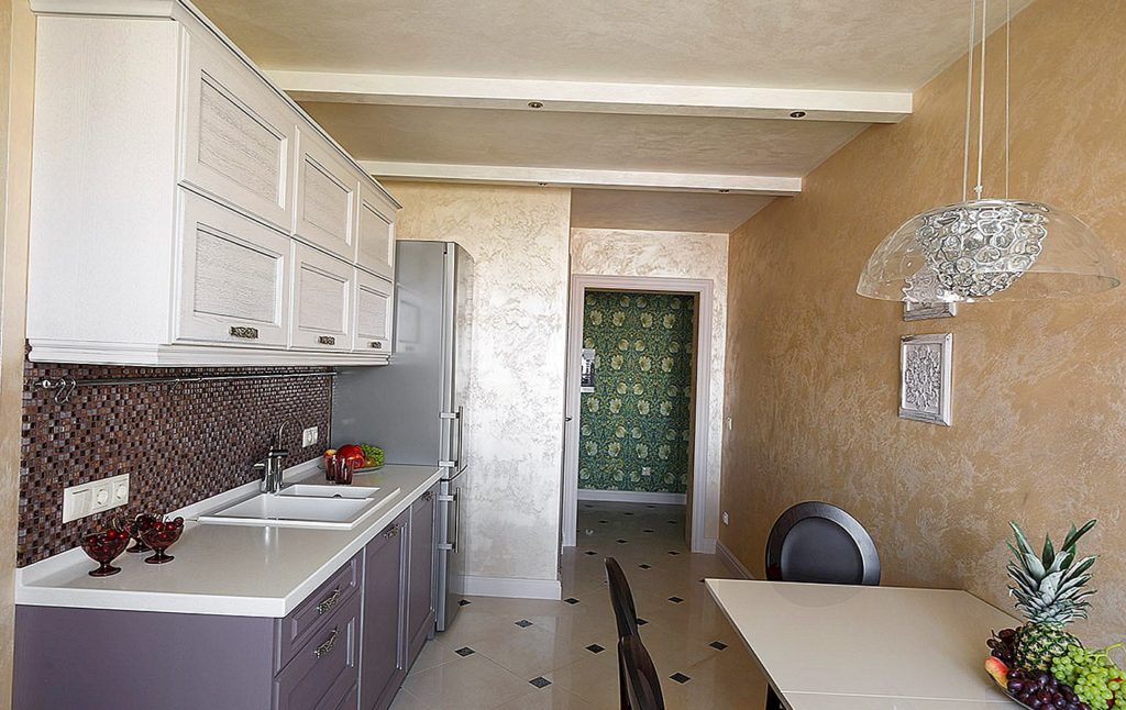 Бежевый тоже часто используется для отделки. Венецианским оштукатуриванием можно выполнить кухонный фартук для классики или неоклассики.