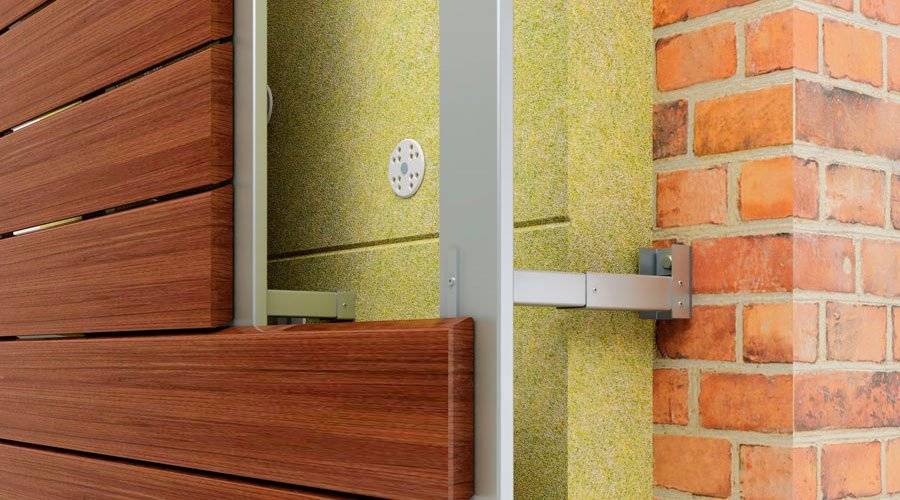Способ крепления схож с методом второго варианта, но только между утеплителем и панелью остается зазор для циркуляции воздушных масс. Технология вентилируемого фасада требует специальную систему крепежа. Необходимое крепление идет в комплекте с панелями.