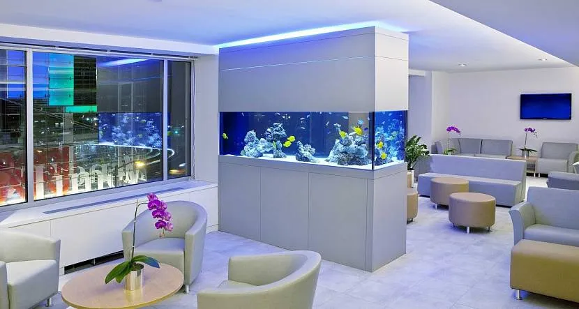 Если помещение достаточно просторное, то можно использовать аквариумы-перегородки. Объем таких изделий больше, чем у ширм, поэтому появляется возможность поселить в них более крупных представителей водного мира. Ширина подобного аквариума позволяет устанавливать его без использования дополнительных креплений.