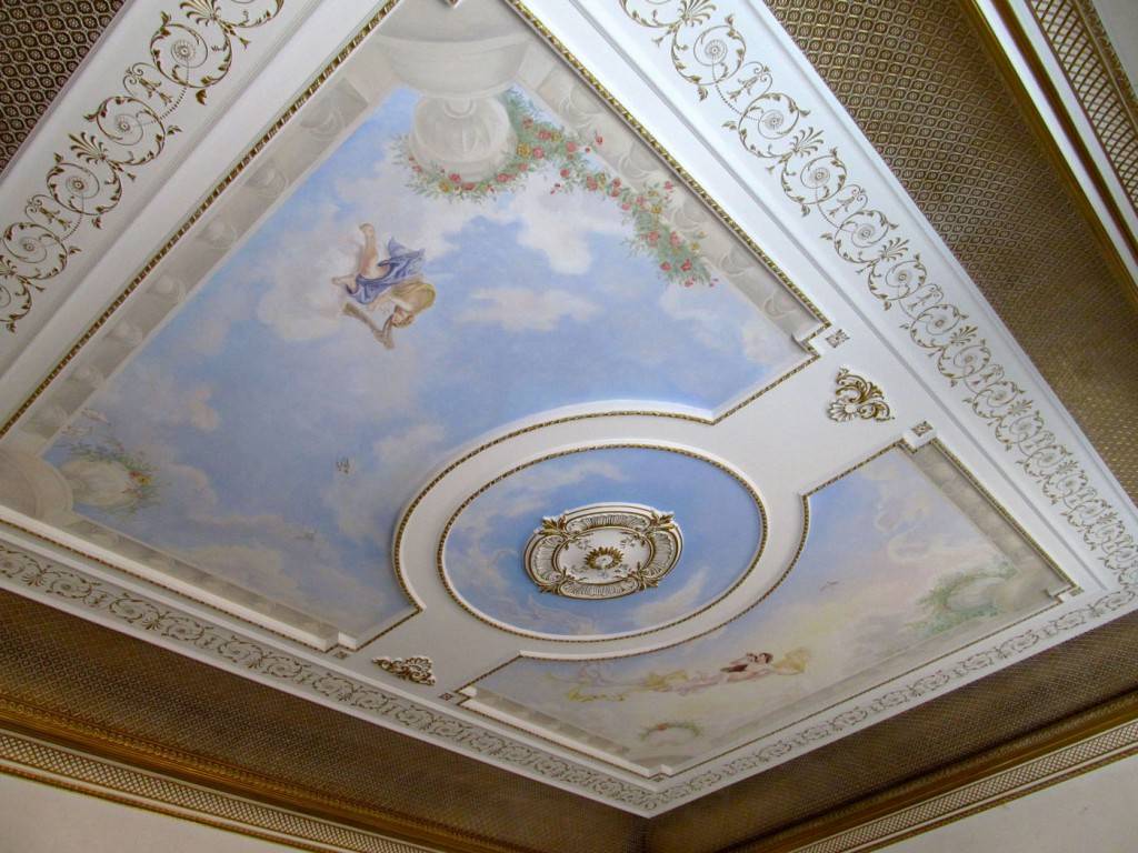 Богатый и роскошный барокко или рококо можно оформить с помощью натяжных моделей, украшенных позолоченными плинтусами, лепниной, фресками или любым другим вычурным декором, который присущ данным стилевым решениям.
