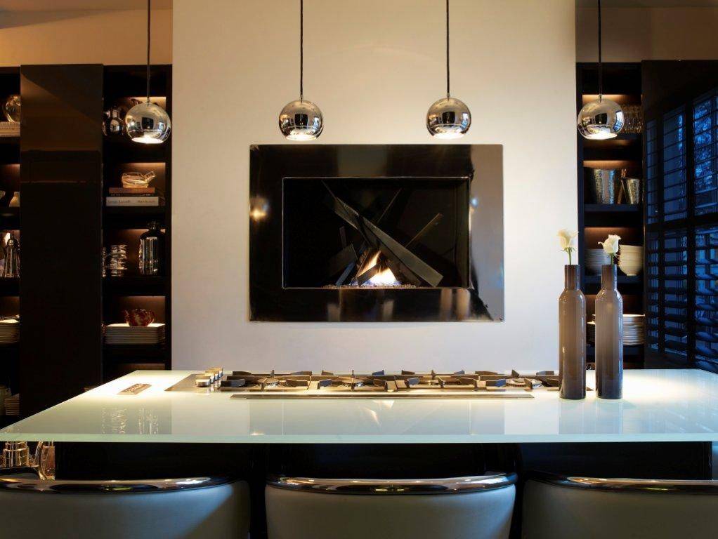 Встроенный биокамин в черной глянцевой раме — современная деталь для дизайна вашей кухни