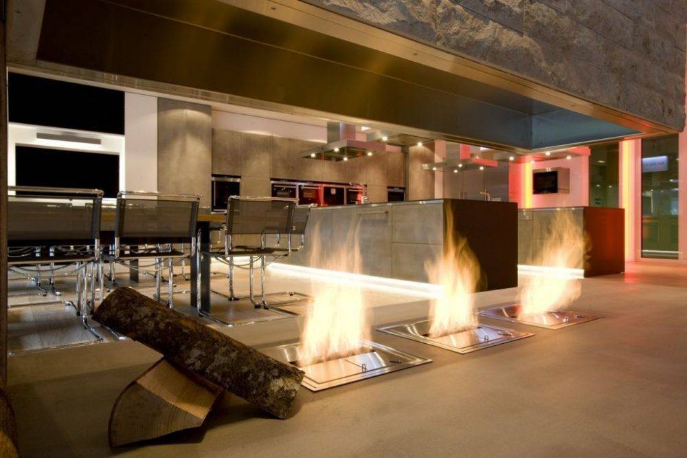 Новомодная тенденция – камины «огненная линия». Для этого несколько модулей топливных блоков составляют вместе – иногда длина может достигать 1,5 м. Ими оборудуют ниши, стены или подиумы в стене в интерьерах, выдержанных в стилистике минимализма или хай-тек.