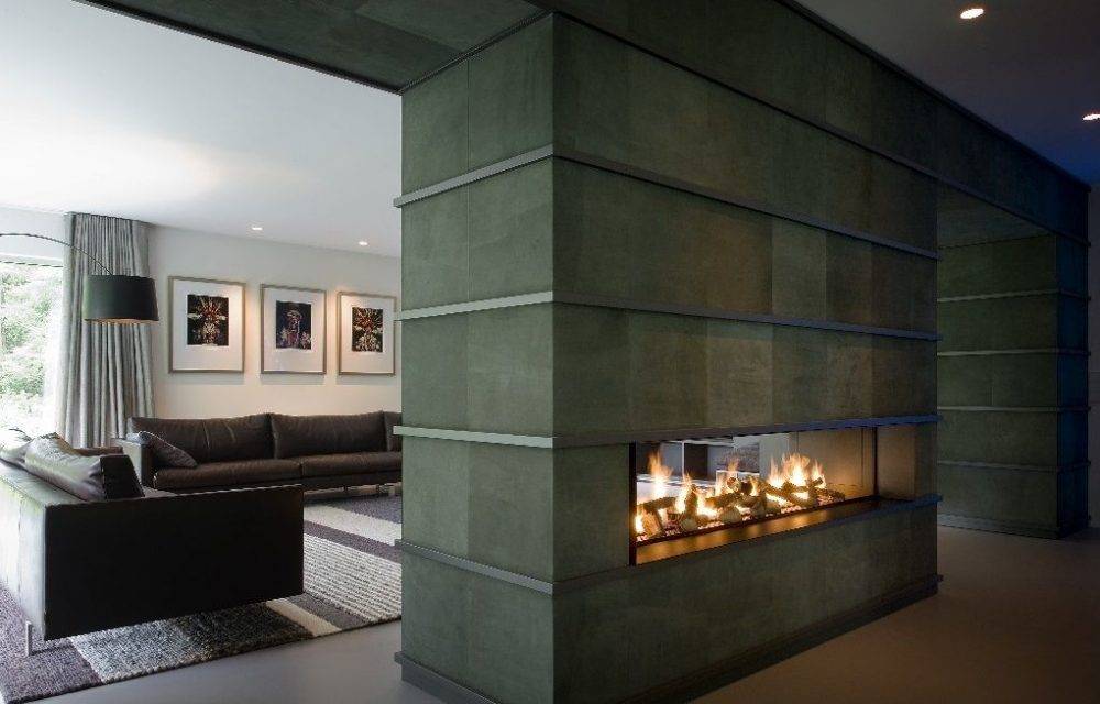 Модели сквозных биокаминов устанавливают в проемах стен, тем самым они обозначают границы между разными функциональными (жилыми) зонами. Если планировка квартиры позволит, можно встроить трехсторонний сквозной камин, эффектно разделяющий пространство на функциональные мини-территории.