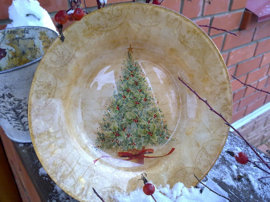 Следующий способ – техника обратного декупажа. Ее преимущественно выбирают в случае, если тарелку планируется использовать по прямому назначению, а не для декора. Что касается процесса оформления, то он такой же, как и в первом способе. Разница заключается в том, что фрагменты рисунка размещают на обратной стороне тарелки