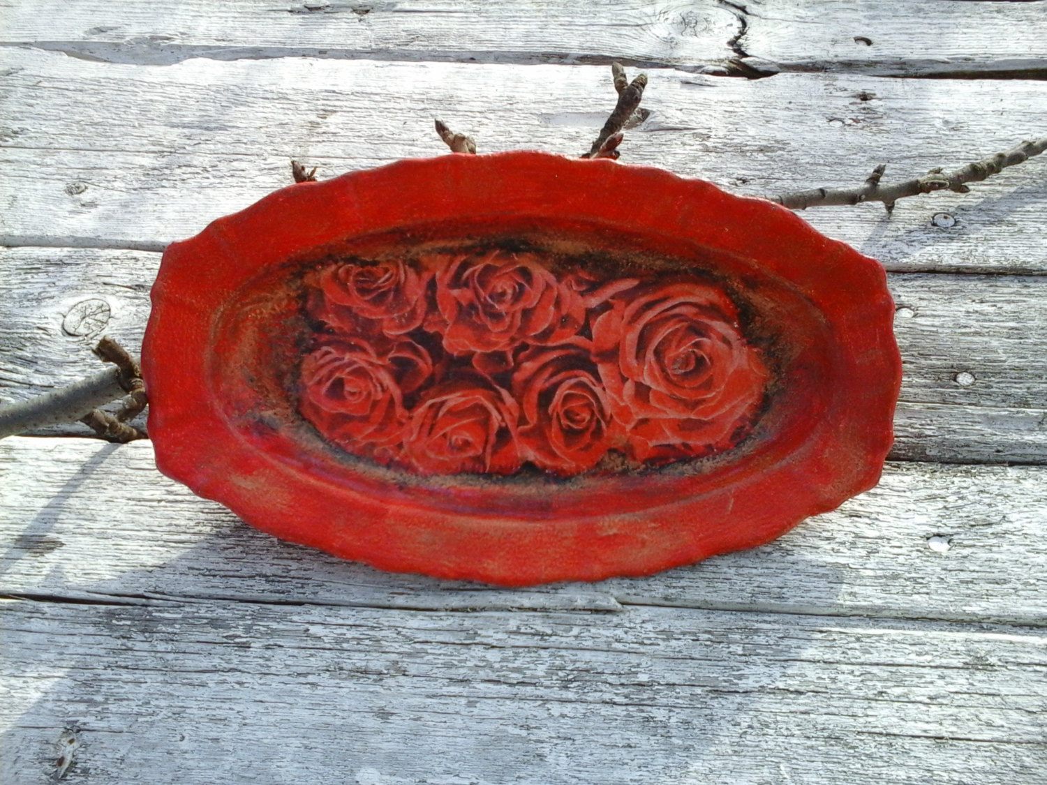 Следующий шаг – раскладка фрагментов изображения и покрытие их клеем. Только после высыхания можно покрыть всю тарелку лаком. В результате получится оригинальная и весьма необычная посуда. Чаще всего ее используют для декора.