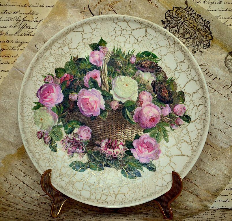 Следующая техника декупажа – кракелюр. Она считается более сложной, чем предыдущий вариант. Вначале, согласно стандарту работы, тарелку обезжиривают. После чего можно нанести грунтовку с помощью губки и дождаться высыхания. Следующий шаг – окрашивание поверхности краской коричневого цвета. Только после этого можно нанести клей ПВА и спустя несколько минут надо нанести акриловую краску белого цвета. В процессе высыхания она растрескивается. Благодаря чему тарелка смотрится очень необычно.
