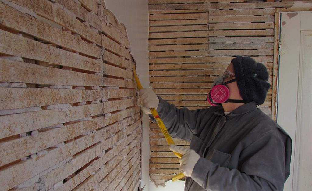 Старые деревянные стены могут оказаться оштукатуренными с помощью дранки, иных подручных материалов, металлической сетки. При отбивании штукатурки вначале не трогают армирующую конструкцию — в ряде случаев ее можно оставить. Если планируется замена сетки, в центре стены делают широкую вертикальную борозду, очищая ее вплоть до дерева. После армирующее покрытие отрывают вместе со штукатуркой.