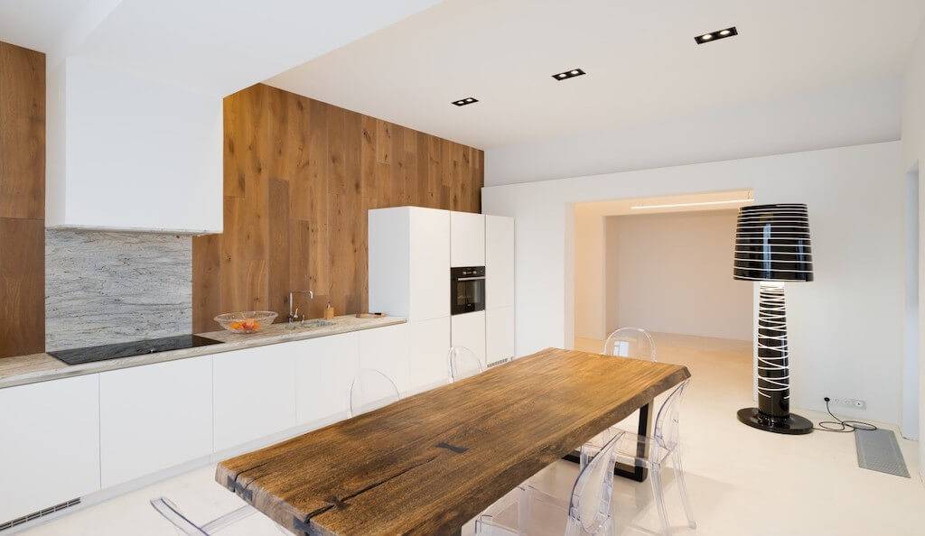 Для чего это нужно и как это поможет создать сочетание дерева в интерьере кухни? То есть, так мы размываем границу между цветом пола и цветом стола выделяющейся деталью. Таким образом, взгляд сосредоточен на ярком пятне, которое находится в центре