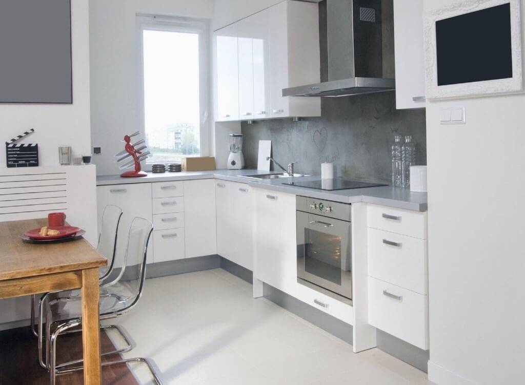 Белые фасады делают кухонный гарнитур похожим на стену и практически незаметным. Зачастую на такой мебели отсутствует фурнитура и украшения, за счет чего достигается эффект расширения пространства. Можно сделать поверхности глянцевыми, тогда они будут отражать свет и сделают помещение еще более просторным.