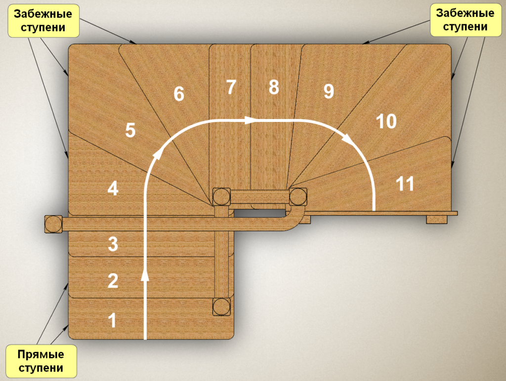 Самая распространенная конструкция лестницы с поворотом представлена в виде 2-ух маршей и нескольких ступеней в месте разворота. Средняя ступень поворота в большинстве случаях служит точкой преткновения.