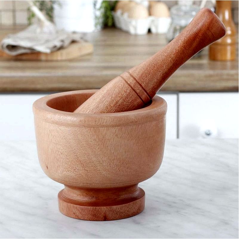 Кухонные ступки обычно делаются из тяжёлого мрамора, который хорошо справится с измельчением трав и специй. Мне также попадались немного меньше популярные модели из керамики и стали. Но на рынке имеются и деревянные ступки! Возможно, они не очень часто появляются на наших кухнях, как мраморные, однако они одинаково хороши для ручного размельчения и перемалывания разных компонентов. Напротив, они намного легче, что выполняет их более простыми во время эксплуатации. Сделанные из очень качественного дерева, они довольно красиво выглядят на кухне.