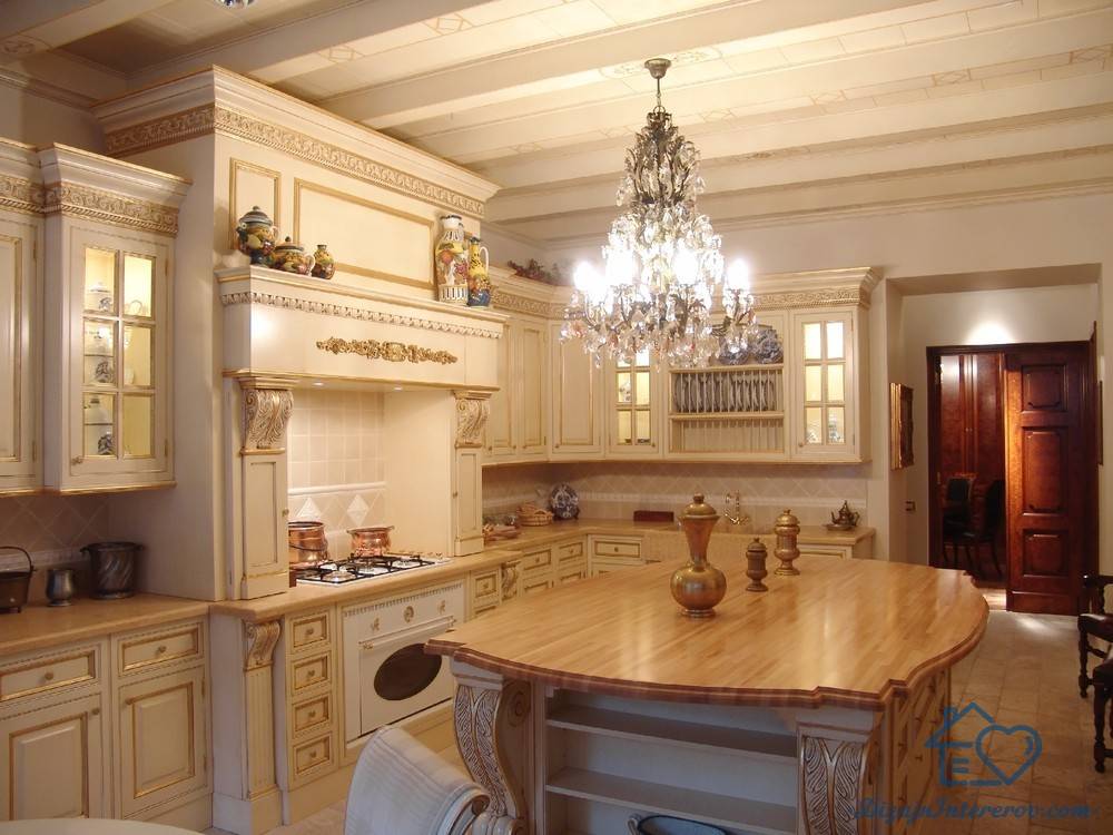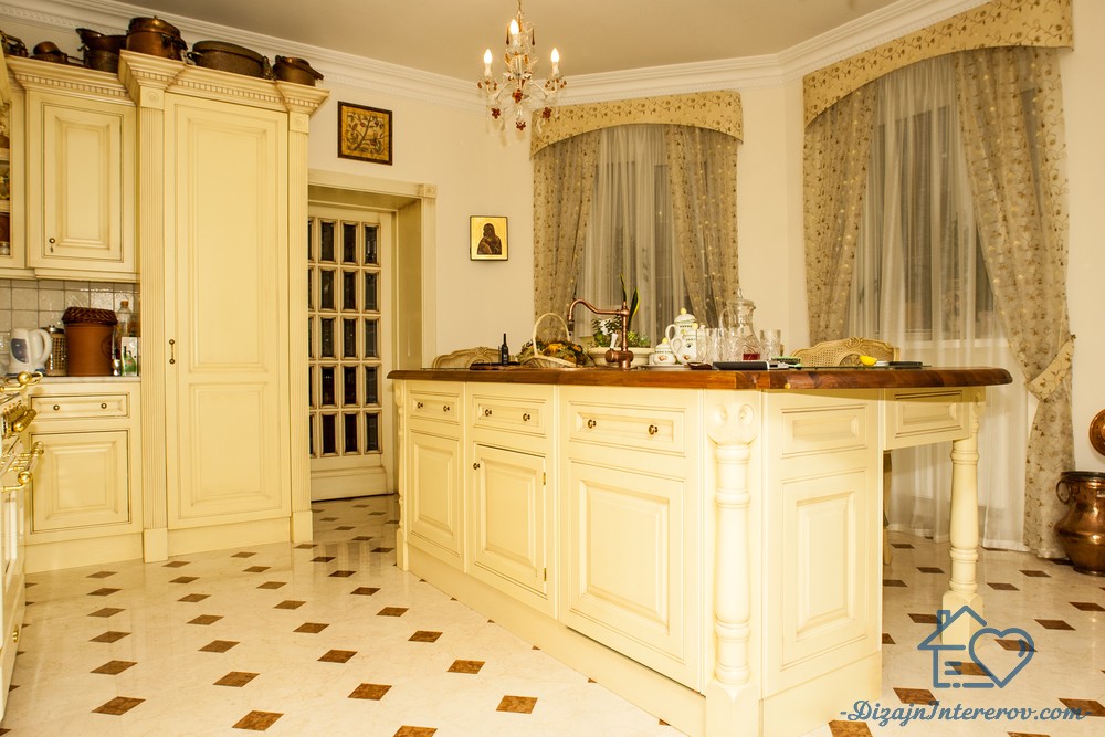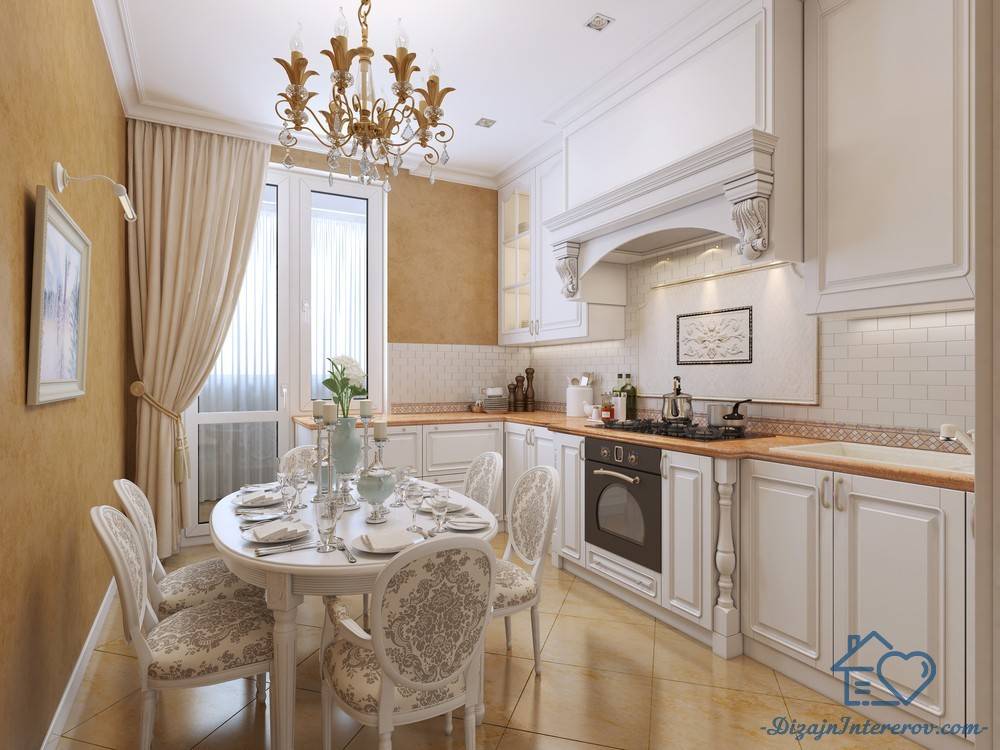 Такая кухня придется по душе практически всем. В данном стиле все сдержано, но не строго. Отлично впишется кухонный гарнитур из массива в светлом цвете с классической фурнитурой. Для освещения можно подобрать «хрустальную» люстру. Обеденная группа должна быть выполнена из тех же материалов, что и кухонных гарнитур. В качестве декора можно использовать вазу с цветами, фарфоровую посуду в серванте или шторы из легких материалов.