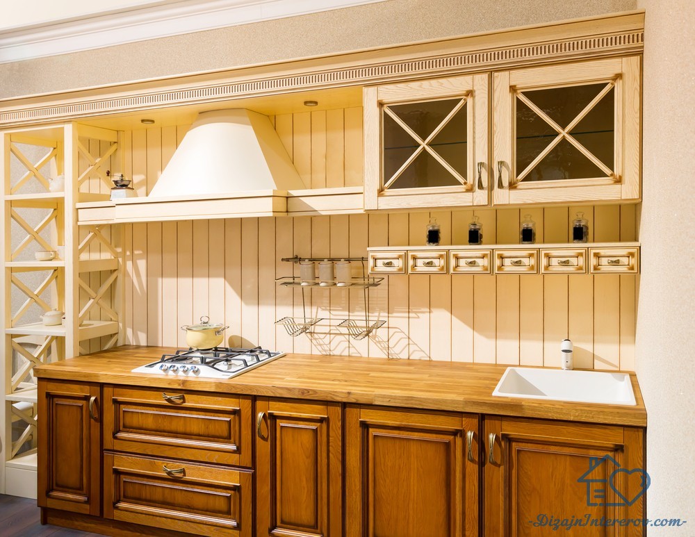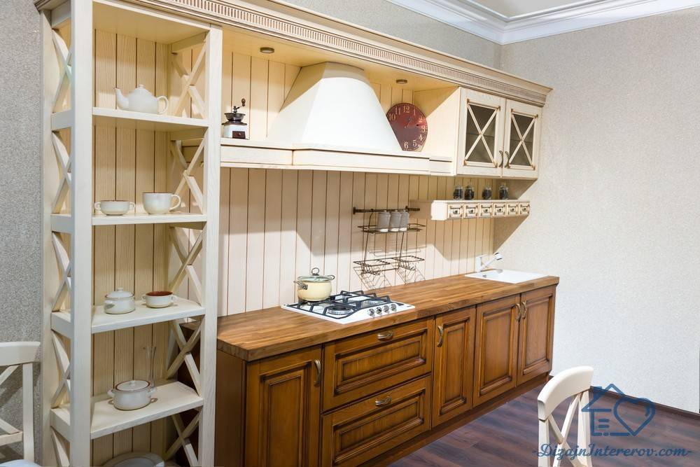 Если вы выбрали кантри, значит хотите, чтобы интерьер вашей кухни был более живым, по-домашнему уютным. В этом случае для столешницы нужно выбрать более светлый оттенок дерева. Он подчеркнёт красоту нежной белизны фасада.