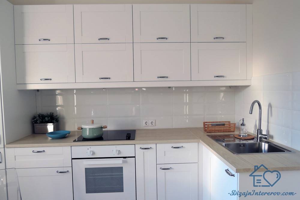 Фартук на белой кухне может быть акцентом или нейтральным функциональным декором. Он может быть из прочного стекла с печатью, из ламината, плитки.
