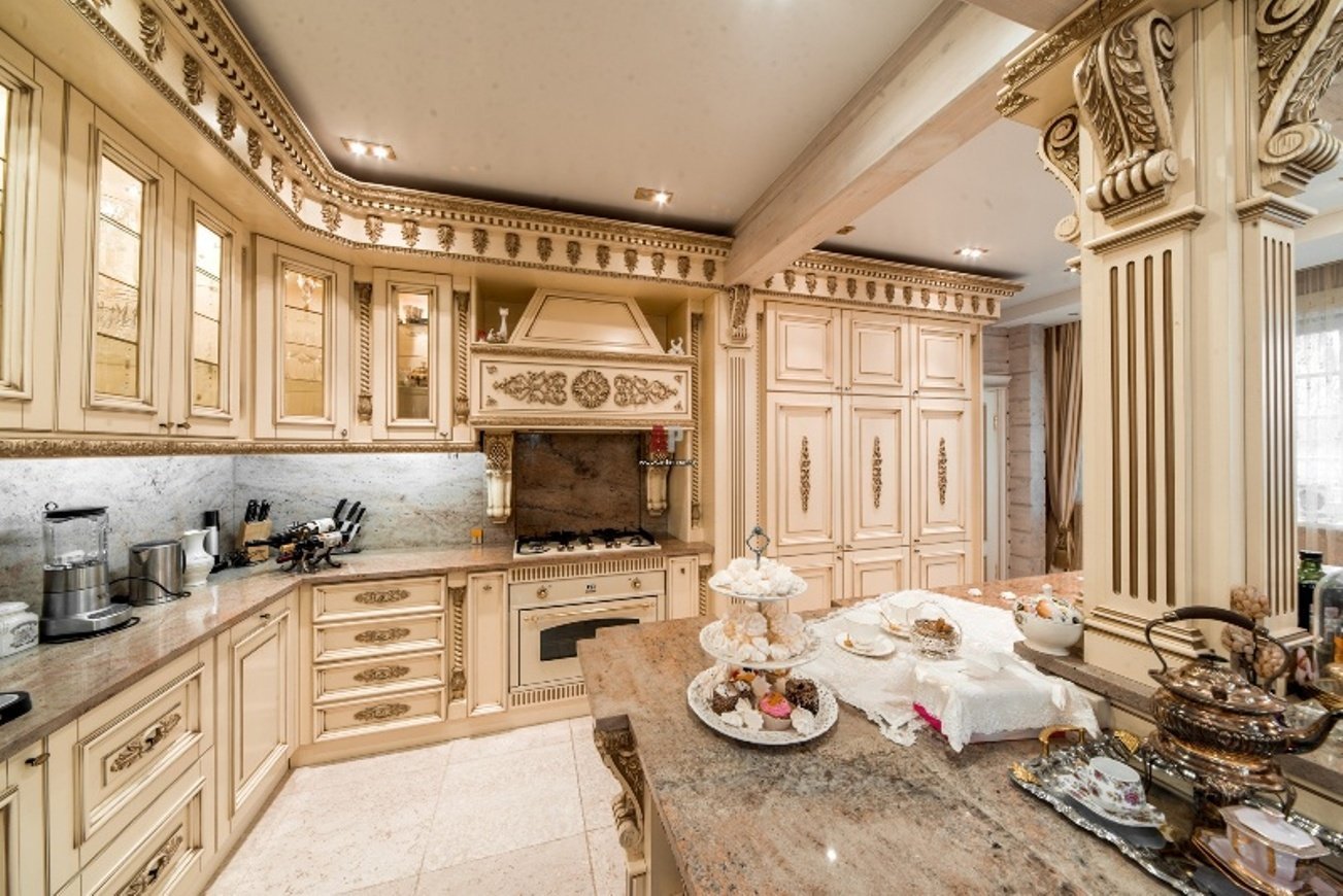 Изящно смотрится на фасаде патина, хрустальная люстра, картина, дорогая посуда. При декорировании нужно соблюдать меру: если других оттенков будет много, стилистика может нарушиться, и кухня перестанет быть похожей на благородно — классическую.