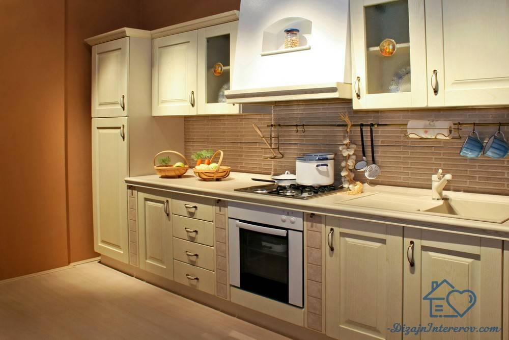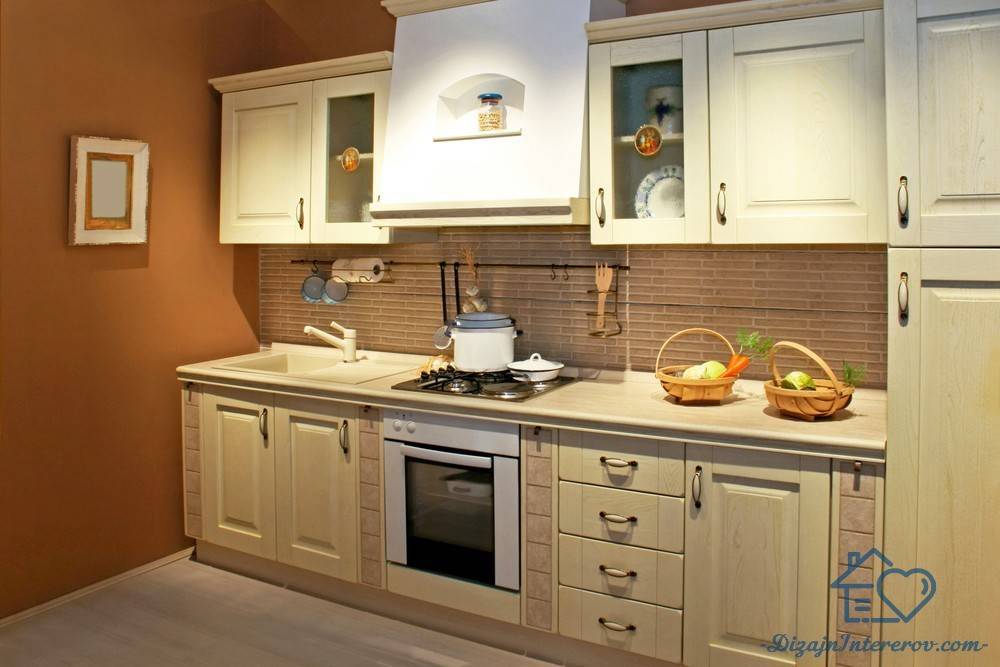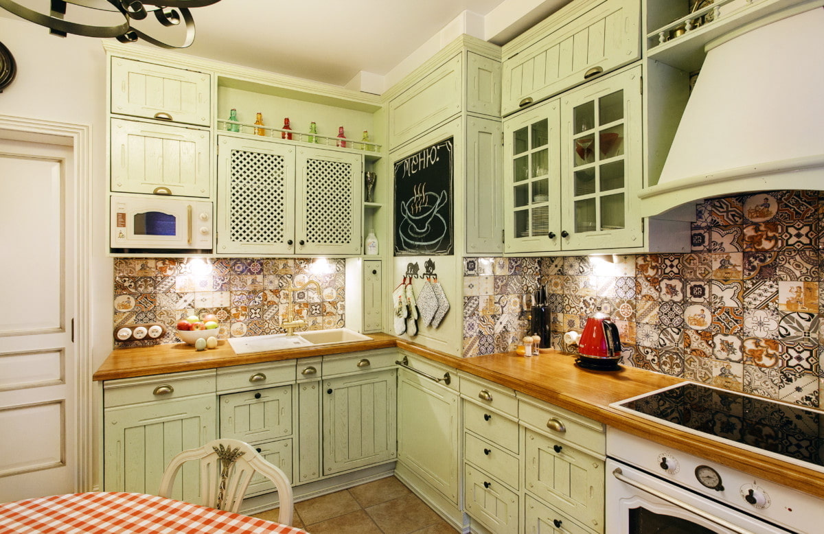 Сочетание такого кухонного гарнитура с контрастными цветными стенами и обилием света образует стиль прованс. Такое оформление кухонной зоны подойдет даже для маленького помещения хрущевок. В дизайне можно использовать фигурные фасады с закругленными углами. Самыми благоприятными оттенками столешницы считаются светлые оттенки кремового и коричневого.
