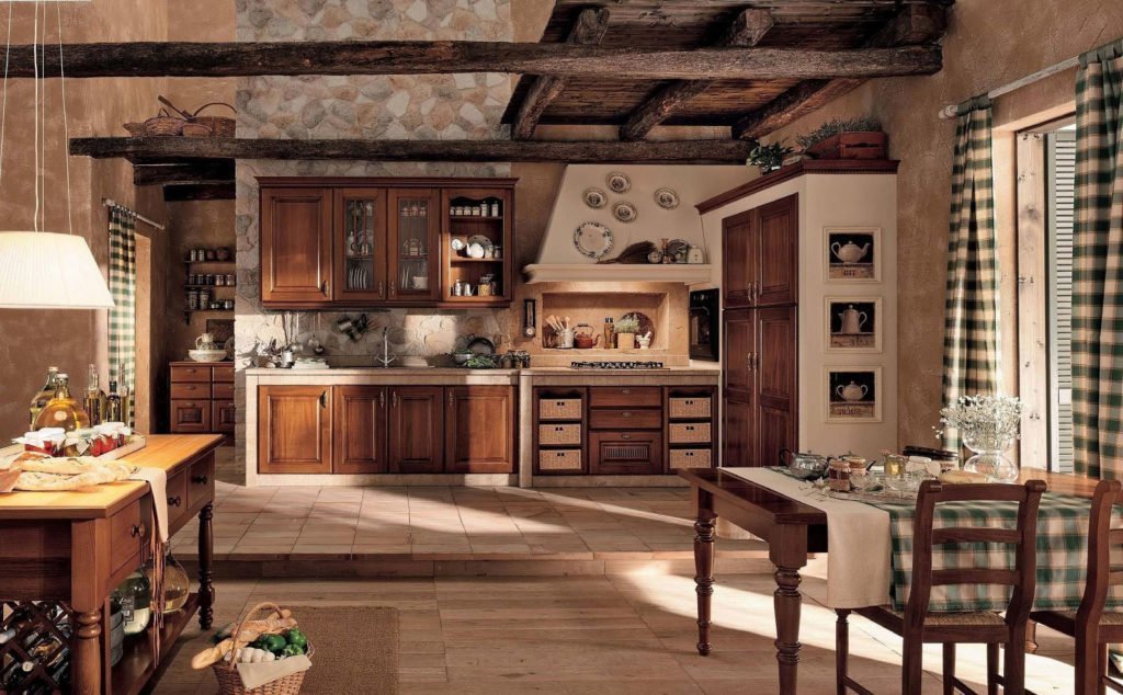 Когда кухня в вашем доме выполнена в стиле кантри, можно позволить себе поэкспериментировать с формами гарнитура. Прекрасно выглядят варианты в подчёркнуто грубом оформлении, это может быть имитация обычных досок – светлых, выкрашенных в белый цвет, и более тёмных.