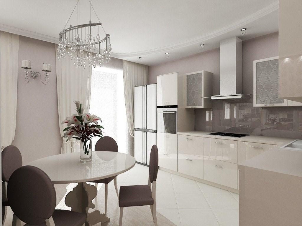Такая кухня придется по душе практически всем. В данном стиле все сдержано, но не строго. Отлично впишется кухонный гарнитур из массива в светлом цвете с классической фурнитурой. Для освещения можно подобрать «хрустальную» люстру. Обеденная группа должна быть выполнена из тех же материалов, что и кухонных гарнитур. В качестве декора можно использовать вазу с цветами, фарфоровую посуду в серванте или шторы из легких материалов.