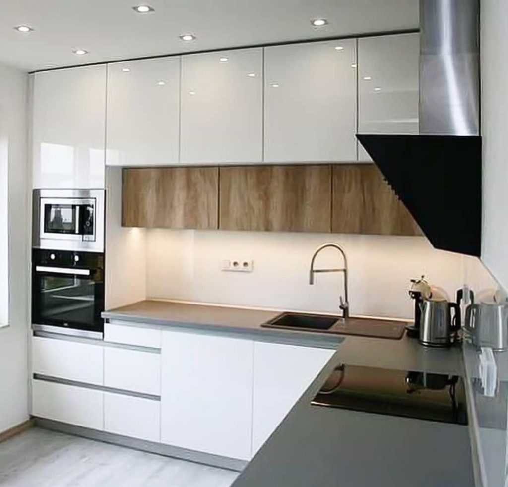 Белый глянец смотрится безупречно, он поможет сделать вашу кухню свежей и нарядной, наполнит пространство светом, сделает её воздушной, а тёмная столешница ещё больше подчеркнёт этот эффект. Однако тёмного дерева не должно быть слишком много – соблюдайте пропорции, которые указаны в начале статьи.