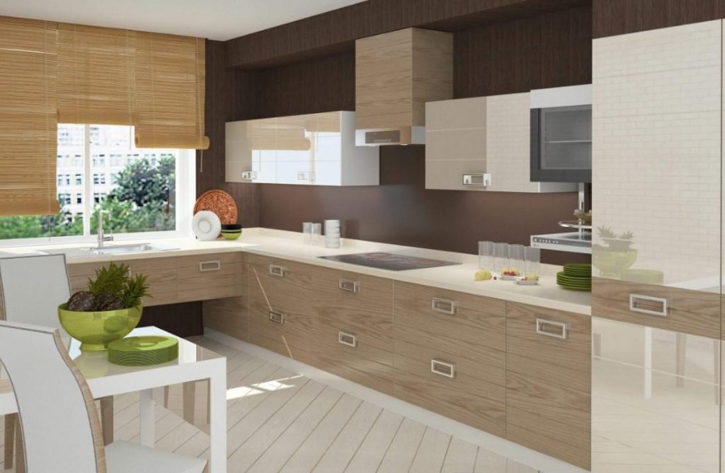 На любой кухне центральным элементом является гарнитур. В современном стиле все чаще используют деревянные гарнитуры, но с добавлением других материалов, например, стекла, камня, плитки, металла. Если установить современную технику, интерьер будет выглядеть достаточно стильно.