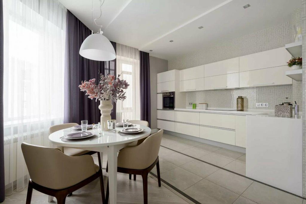 Для него характерны простота и практичность. С помощью светлых оттенков кухня получится не только современной, но и визуально просторнее. Кухонный гарнитур должен быть сдержанным, без вензелей и резных фасадов. Встроенная бытовая техника будет отличным решением. В качестве занавесок для окон стоит использовать жалюзи или римские шторы.