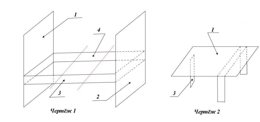 Кровать распиливают. На чертеже № 1 цветным пунктиром показаны линии распилов. В результате получается 4 детали: под номерами 1 и 2 – будущие столешницы с двумя ножками, под цифрами 3 и 4 – третьи ножки