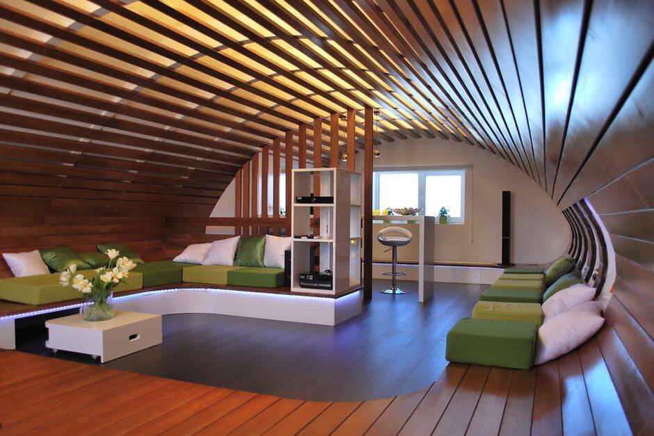 Проект такого типа потребует от вас достаточных умственных усилий, а также выдержки при монтаже. В отношении условий его установки есть ограничения по высоте потолков — они должны быть не меньше 2,5 м. В противном случае их уровень опустится настолько, что внутри будет находиться неуютно.