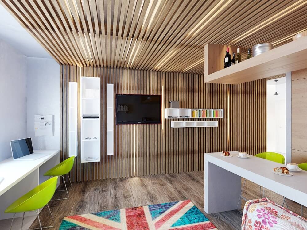 Оформить деревянными рейками можно не только потолок, но также и стену