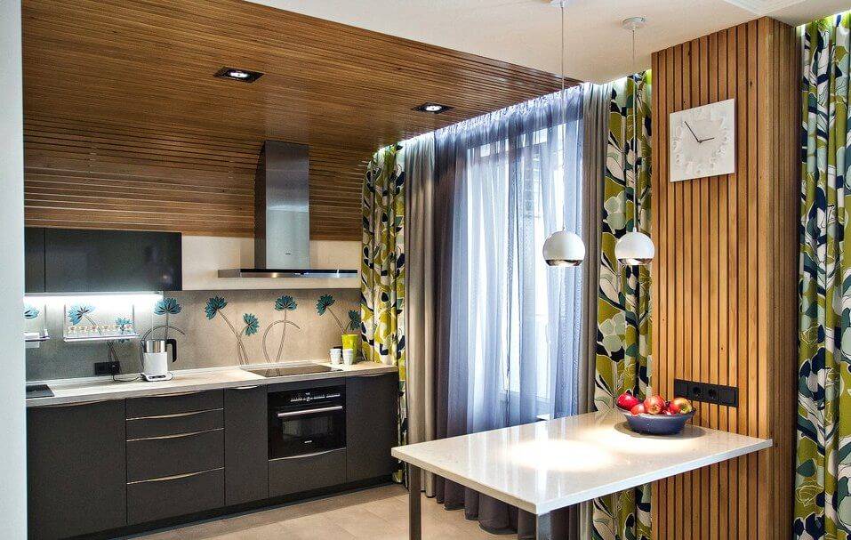 Прекрасно оформленный интерьер кухни с использованием деревянного реечного потолка