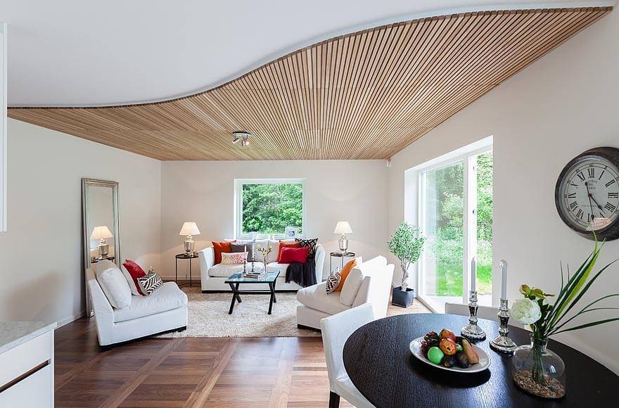 Обшивка деревом – 100%-ное удачное решение. В результате покрытие будет отлично гармонировать с общим видом комнаты, и явных недостатков в такой реализации просто нет. Далее предлагаем вам более подробно ознакомиться именно с этим вариантом.