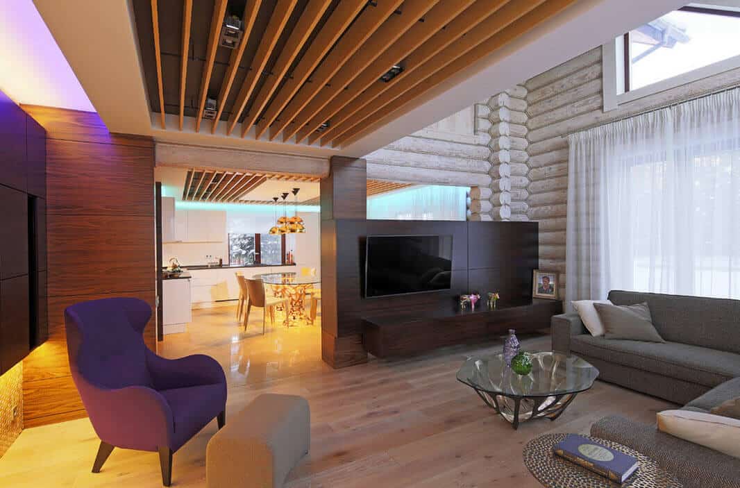 Чистый и белоснежный дизайн гостиной с применением натуральных материалов на потолке