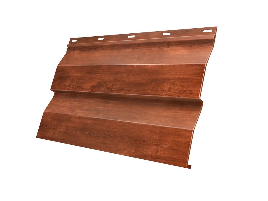 - Сайдинг «Орех». Стандартные размеры 2 см × 16,5 см × 400 см, толщина стенок 0,6 см, глубокая степенью рифления. Основная цветовая гамма недостаточно разнообразная и представлена коричневым, а также тёмно-коричневым оттенками.