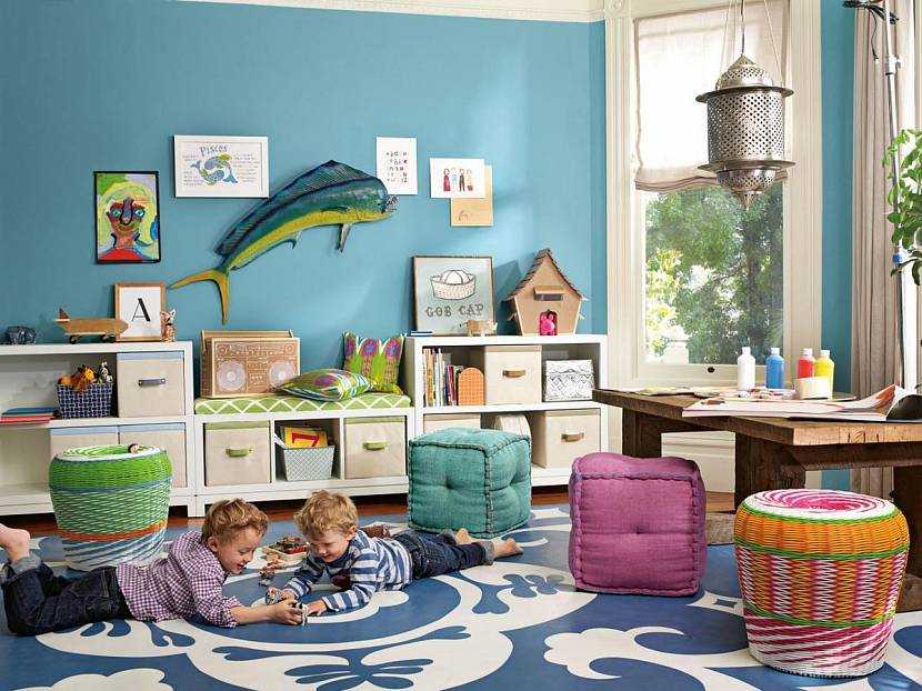 Игровая зона оборудуется ковром на полу, коробкой для игрушек. Лучше поставить два ящика, если дети маленькие.
