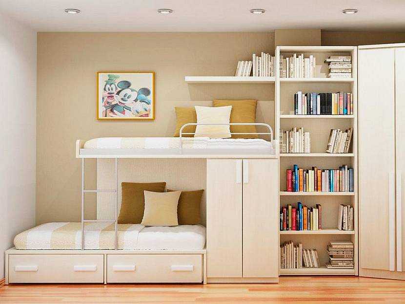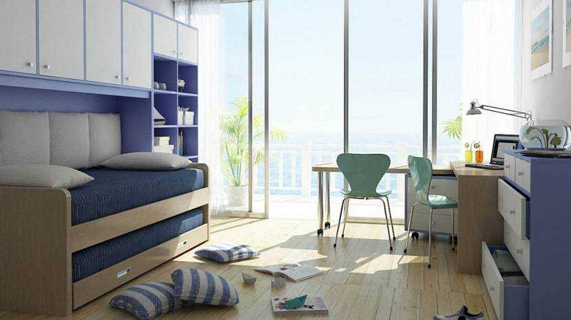 Когда комната для двух мальчиков ограничена по площади, рекомендуется остановиться на двухъярусной кровати, кроватях-чердаках или с выкатным механизмом. Используются раскладные диваны, большие кресла-кровати, хотя это не особо комфортно, мешает здоровому сну.