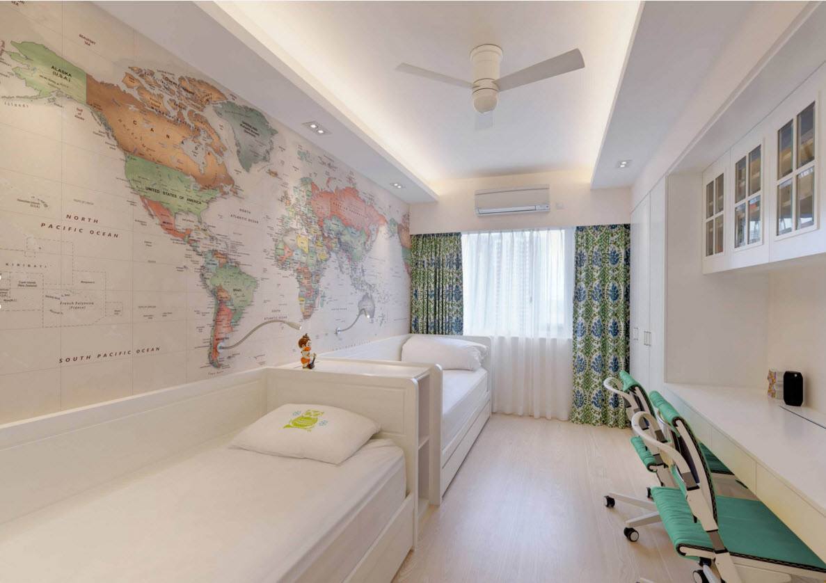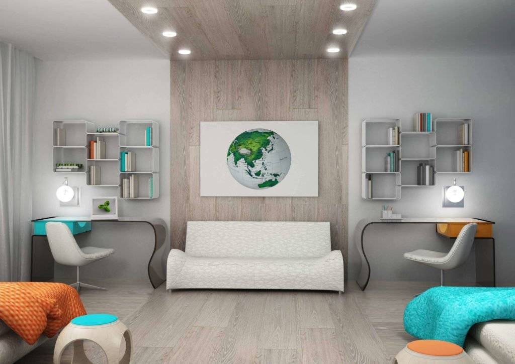 современный. В нем преобладают лаконичность и строгость форм, нейтральные оттенки, минимализм во всем. Здесь нет места лишним мебельным предметам, декорам и другим вещам. Это идеальный вариант при обустройстве небольшого помещения для двоих. Мебель в таком интерьере выбирается трансформирующаяся. Она отличается эргономичностью, функциональностью и стильным внешним видом. Стены декорируются в один цвет без принтов и орнаментов. Иногда допускается сделать несколько ярких акцентов на светлых поверхностях. Такой интерьер подойдет дошкольникам от 10 лет;