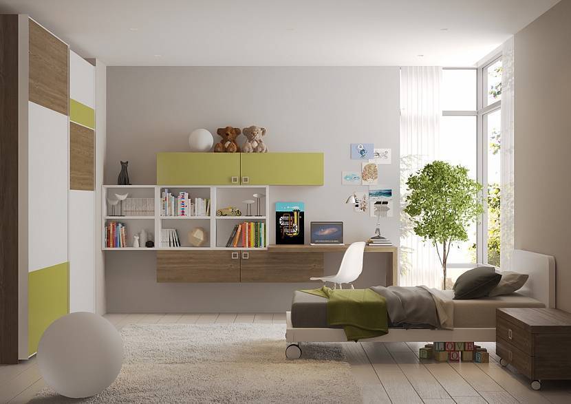 Это спокойный и в то же время тонизирующий цвет. Он отлично впишется в интерьер детской для мальчика, основанный на натуральных материалах. А зеленые пейзажи или фотообои порадуют юных любителей природы и походов.