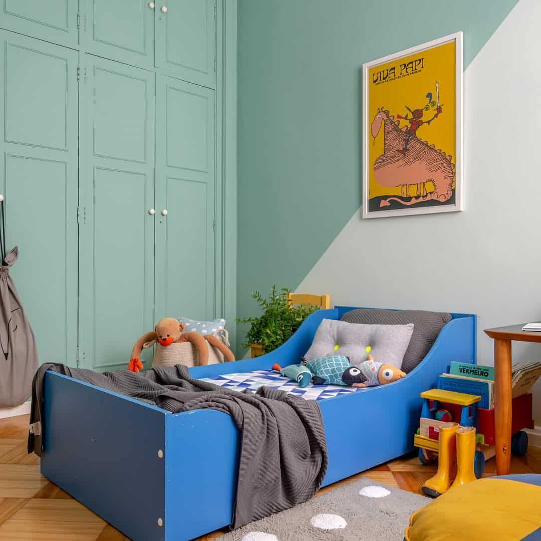 Но если фон помещения нейтральный и светлый, то детская мебель бирюзового цвета будет вполне уместна.