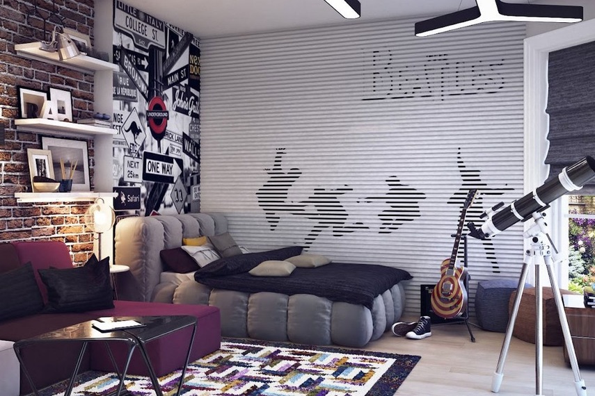 - Декоративное оформление. Декор комнаты для мальчиков, не менее важен, чем для девочек. Подростки сами выберут нестандартные аксессуары (картины, рекламные постеры, дизайнерские штучки, дорожные знаки), которые сделают комнату еще выразительнее. Многие ребята подросткового возраста любят граффити, и именно лофт позволит им без ущерба для общего дизайна использовать в интерьере «художества», как украшение своего личного пространства.