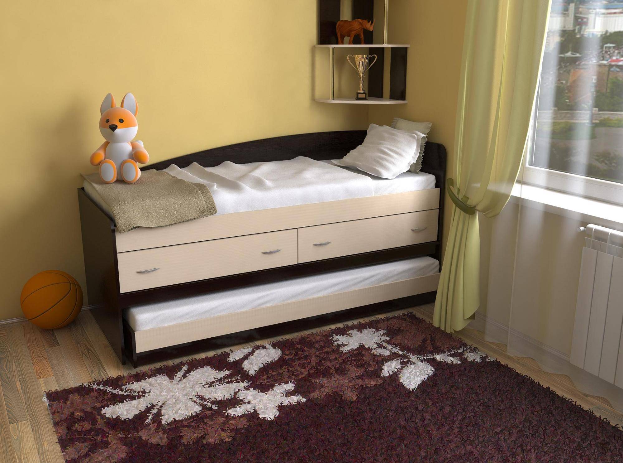 Это могут быть выездные кровати, когда нижнее спальное место выкатывается из под верхнего. Такой вариант позволяет удобно спать двум малышам, не достигшим шести лет, необходимых для второго этажа.
