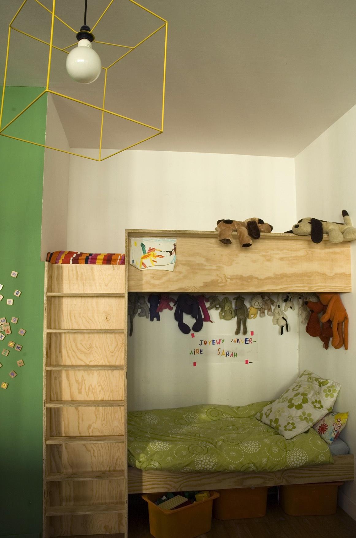 Иногда «первый этаж» применяется для расположения комодов, ящиков с игрушками, которые могут прятаться и в ступенях лестницы, часто можно встретить двухъярусные кровати со шкафом и ящиками. Такая модель практически полностью разрешает проблему меблировки детской, позволяя отдать все остальное пространство комнаты под игровую зону.