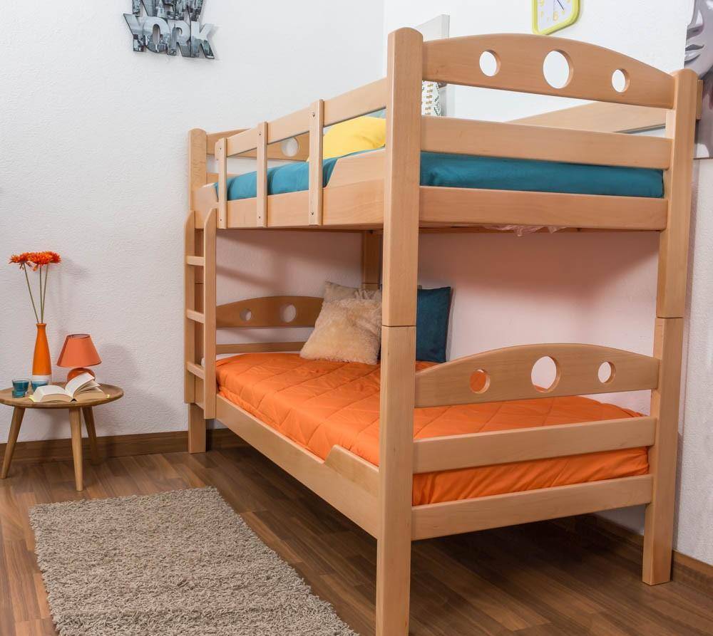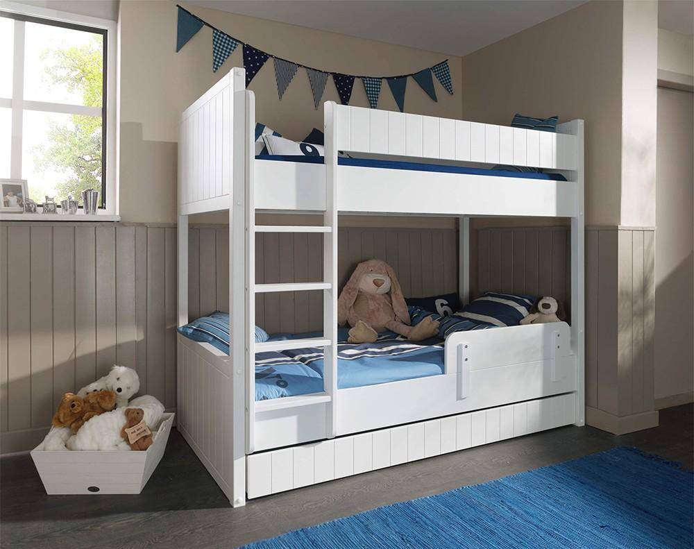 Это тоже непростой вариант. Но здесь хотя бы можно попросить старшего ребенка уступить младшему. Тип конструкции двухъярусной кровати может быть любым: классическим, со смещением в сторону или перпендикулярным. На верхнем ярусе обычно спит старший ребенок: ему интересно пользоваться лестницей (она может быть встроенной), которая для младшего представляет опасность.