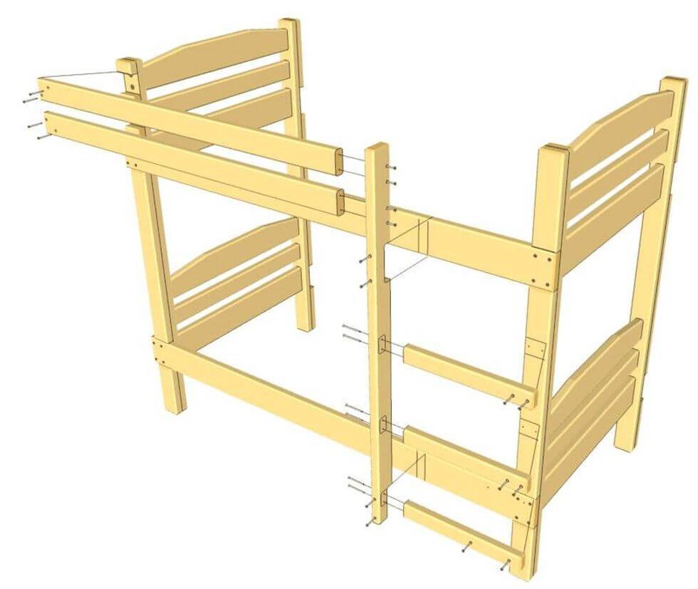 Легче всего изготовить кровать из бруса и обрезной доски. Каркас состоит из четырех вертикальных стоек, которые в узкой части кровати соединяются горизонтальными элементами при помощи деревянных дюбелей и столярного клея. Затем части изголовья и изножья соединяются длинными боковыми панелями с помощью шурупов. Для лестницы понадобится дополнительная стойка. Шаг ступенек не должен превышать 250 мм.