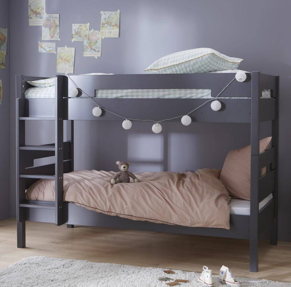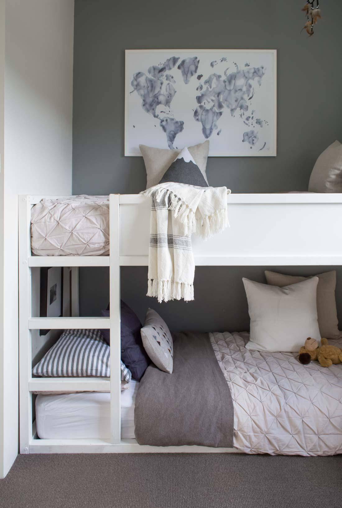 На фото интерьер детской с двухъярусной деревянной кроватью-домиком серого оттенка.