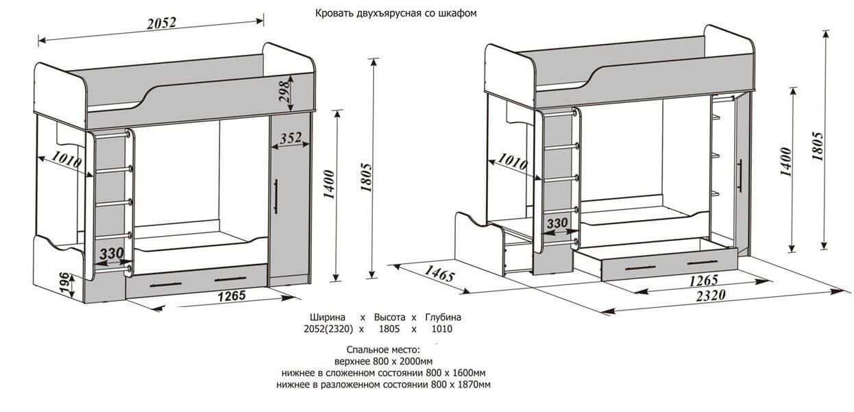 Можно выполнить двухъярусную кровать из листов фанеры или МДФ. Ниже приведена схема кровати со шкафом и выдвижным ящиком. Верхнее спальное место размером 800х2000 мм, нижнее раздвижное: в сложенном состоянии 800х1600 мм, в разложенном – 800х1870 мм.