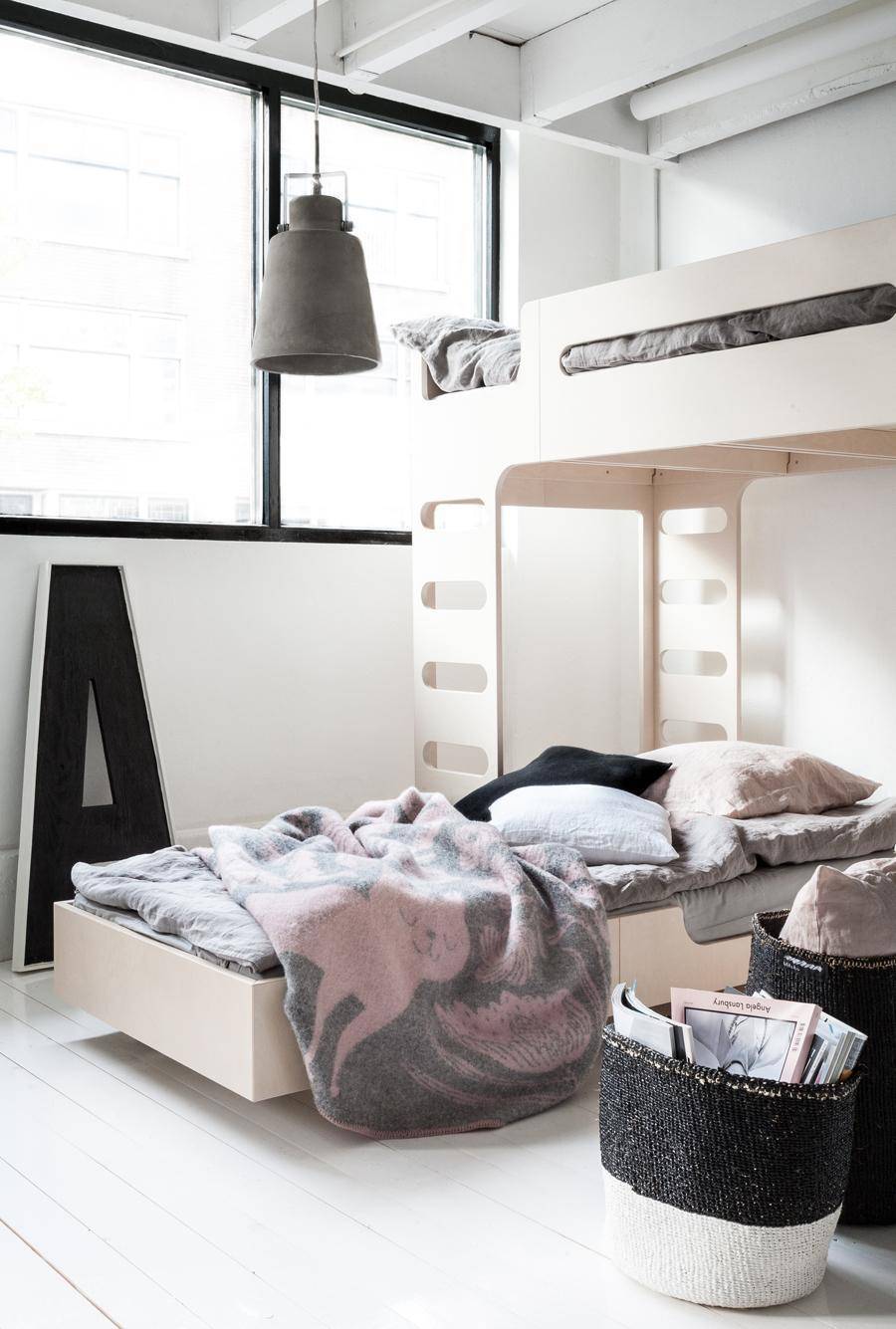 Эта конструкция обеспечивает пару полноценных спальных места при минимальном использовании площади комнаты. В большинстве случаев наверху спит старший ребенок, внизу – младший.